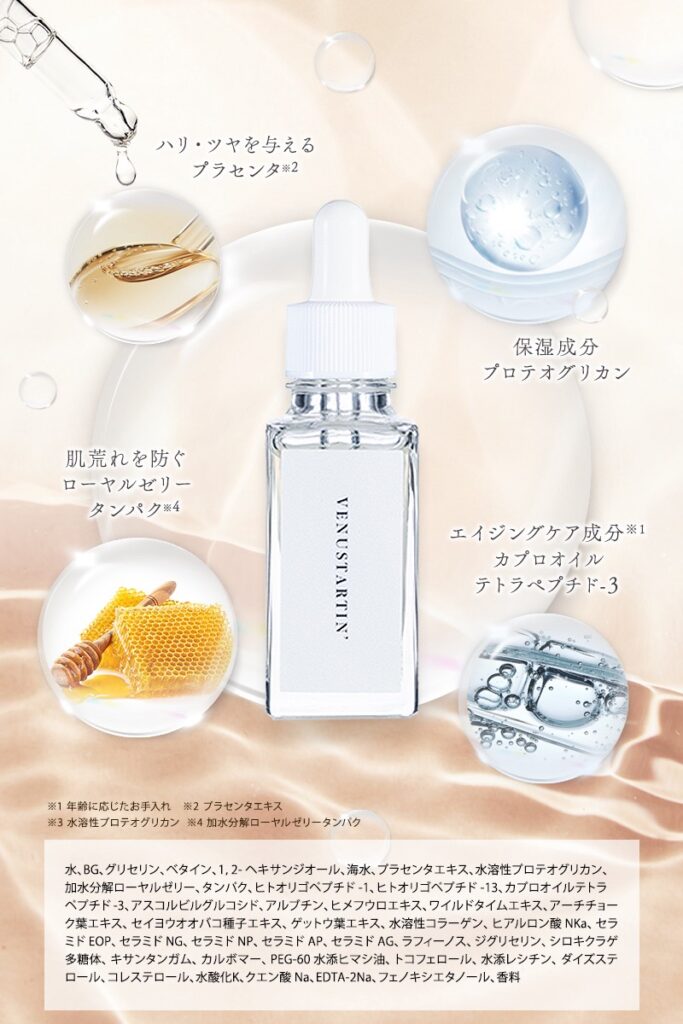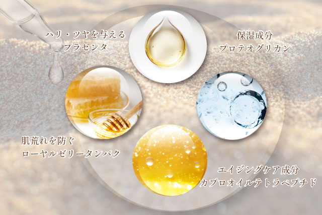 ※プラセンタ=プラセンタエキス、プロテオグリカン=水溶性プロテオグリカン、ローヤルゼリー=加水分解ローヤルゼリー