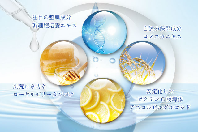 ※間細胞培養エキス=ヒト幹細胞順化培養液エキス、ローヤルゼリータンパク=加水分解ローヤルゼリータンパク