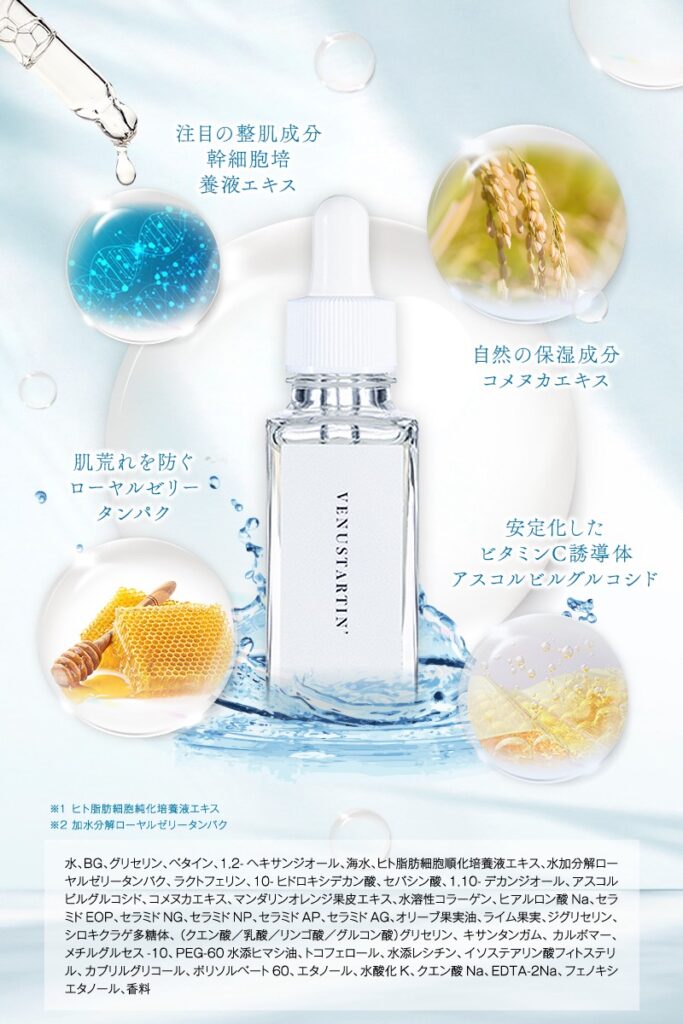 水、BG、グリセリン、ペタイン、1.2-ヘキサンジオール、海水、ヒト脂肪細胞順化培養液エキス、加水分解ローヤルゼリータンパク、ラクトフェリン、10-ヒドロキシデカン酸、セパシン酸、1,10-デカンジオール、アスコルビルグルコシド、コメヌカエキス、マンダリンオレンジ果汁エキス、水溶性コラーゲン、ヒアルロン酸Na、セラミドEOP、セラミドNG、セラミドNP、セラミドAP、セラミドAG、オリーブ果実油、ラフィノース、ジグリセン、シロキクラゲ多糖体(クエン酸/乳酸/リノール酸/オレイン酸)グリセリン、キサンタンガム、メチルグルセス-10、PEG-60水添ヒマシ油、トコフェロール、水添レシチン、ダイズステロール、カプリリルグリコール、ポリソルベート60、エタノール、水酸化K、クエン酸Na、EDTA-2Na、フェノキシエタノール、香料